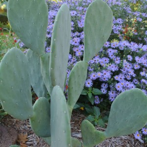 A smooth prickly pear cactus stands proudly in front of a show of fall aster